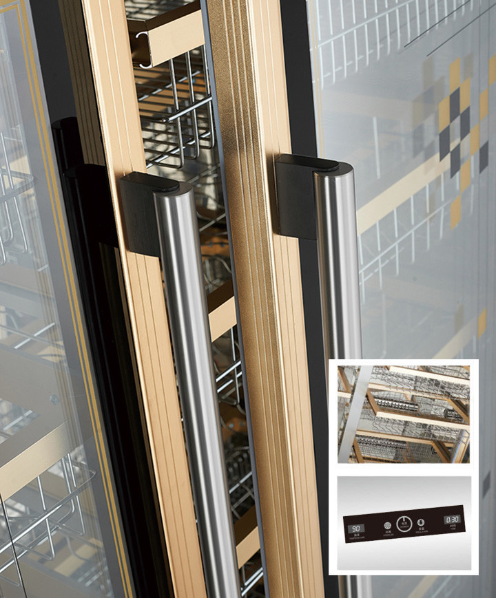 電腦控制觸摸屏,光波高溫消毒;可透視玻璃門,整體發(fā)泡保溫;豪華不銹鋼把手,鋁合金推拉式導軌;特設(shè)超高溫保護功能。